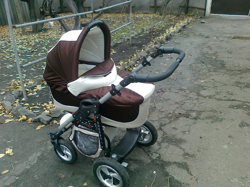 На задней раме расположены тормоза(при нажатии на тормоз, блокируются сразу два задних колеса) и регулируемые амортизаторы(регулируются в трёх положениях Надежные, большие, резиновые колеса с подкачкой на подшипниках и с литыми протекторами обеспечивают жесткое сцепление с любой дорогой. Передние колеса вращаются на 360°, придавая коляске высокую маневренность, легкость в управлении и блокируются одним нажатием.Глубокая теплая люлька придется по душе вашему малышу. Люлька кажется не очень большой, но размеры стандартные: длина-80см, ширина-40см и высота-23см. На раме коляски Андрокс (Androx) люлька крепится системой Easy Click, люльку очень легко устанавливать и снимать - рис.6. Вес люльки - 4,5кг.