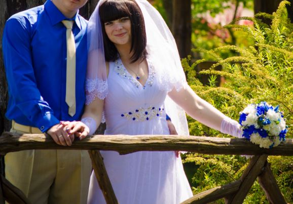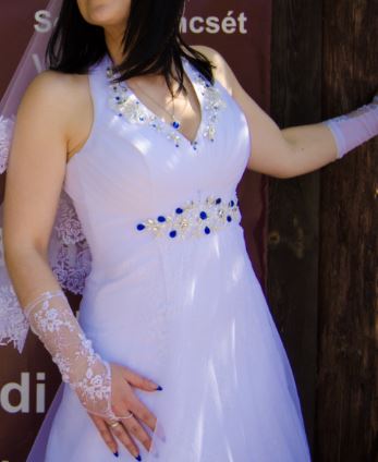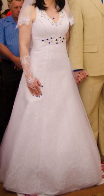 Красивое свадебное платье! Очень удобное! Одето один раз!Не венчаное.В отличном состоянии! Платье белое. Синие камушки можно заменить на белые. Размер 44-48.Корсет на шнуровке .В комплекте подъюбник |