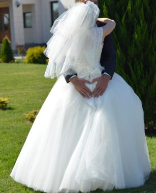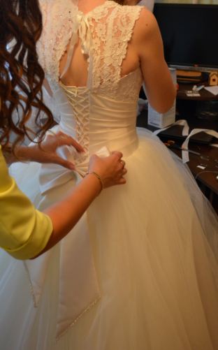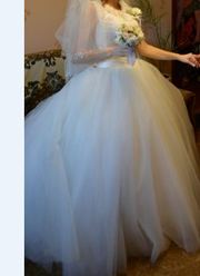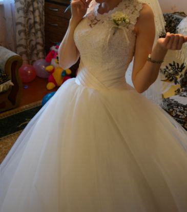 В отличном состоянии, одевалось один раз. Пышное, корсет плотный на молнии и шнуровке,с закрытым декольте ажуром. Юбка из 5-и слоев фатина + вшытой подъюбник из жесткого фатина, с бантом сзади. размер - 42-46 (регулируется шнуровкой). рост -165 + каблук 8 см. цвет - айвори. К платью идут кольца. |