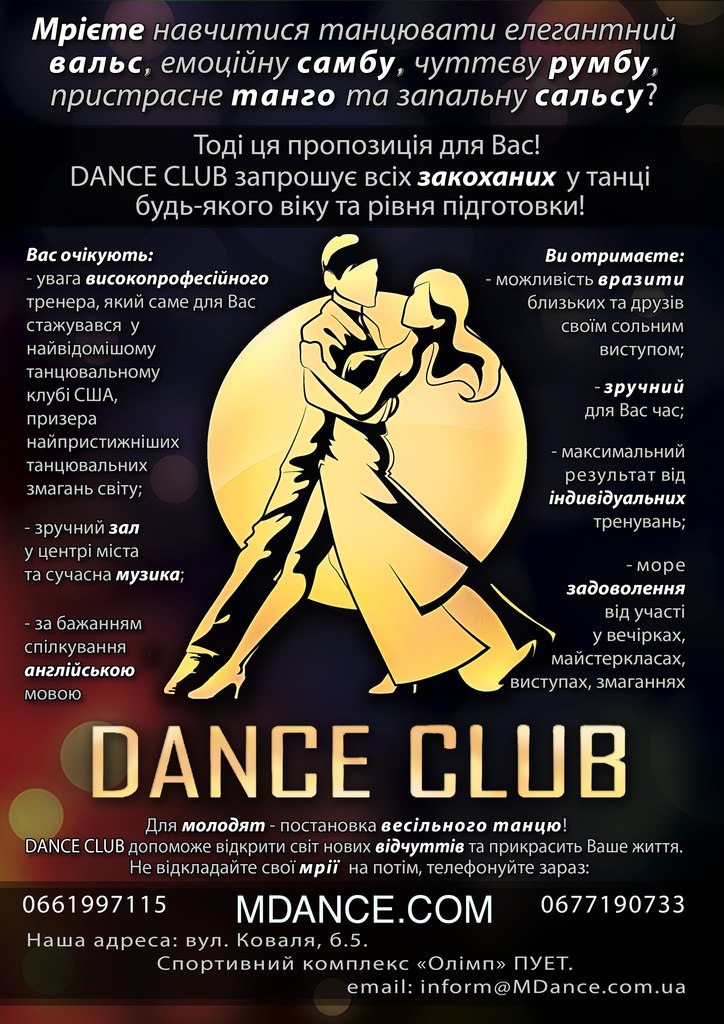 Для молодят - постановка весільного танцю. Dance Club допоможе відкрити світ нових відчуттів та прикрасить Ваше життя. Не відкладайте свої мрії на потім, телефонуйте зараз. |
