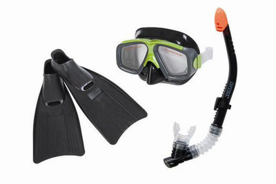 Набор для плавания (маска+трубка+ласты) Surf Rider Sports Set Intex 55959 ? отличный набор, который позволит Вам и Вашему ребёнку познать всю прелесть подводного плавания. Обод маски выполнен из гипоаллергенного термопластичного материала, благодаря которому обеспечивается плотное и мягкое прилегание.