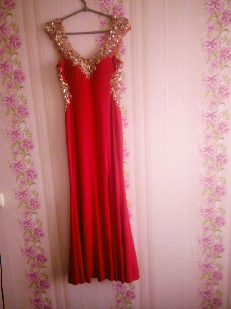 Вечернее красное платье с открытой спиной в пол, с обшитыми камнями и разрезом на на правой ноге. Размер 44-46. |