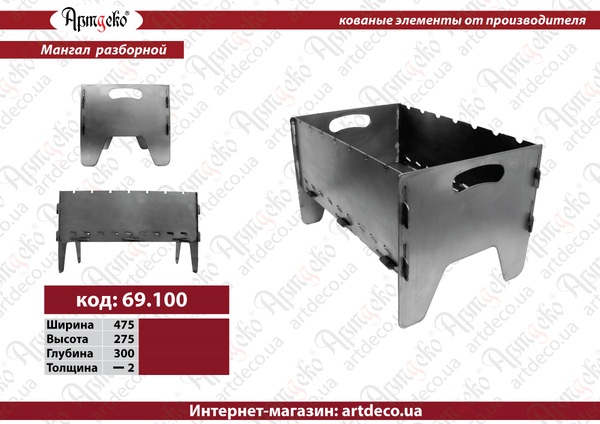 Мангал разборный состоит из 5-ти частей, 4 стенки и дно. Размер 475х275х300мм, лист толщиной 2мм. Количество ячеек для шампуров 7 пар. Производим в любом количестве в кротчайшие сроки. Больше информации по телефону. |
