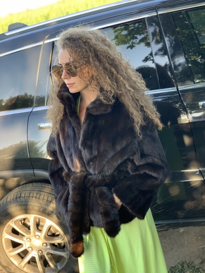 Шикарная норковая шуба полушубок натурального темно-коричневого окраса, норка канадская. Модель шубки -трапеция, приталивается меховым поясом, который идет в комплекте. Рукава широкие, длина стандартная, пройма занижена за счет чего шубка идеально садится по фигуре. Воротник-высокая стойка, можно носить как отложной. Длина шубки 65 см. Подходит на размер 48 50.