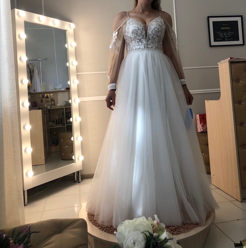 Витончена весільна сукня, розмір 50, мій зріст 182, вдягала без підборів, була в балетках) ОГ 107 ОТ 87 ОБ 108, але все регулюється Продаю за 5000 грн Можливий торг Анжеліка 0956654911 |
