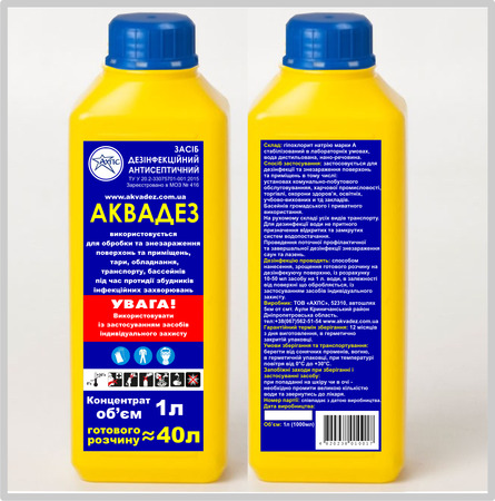 Виробник ТОВ "Аульська хлоропереливна станція" 1л концентрату = 400л готового розчину 0,1% по активному хлору. Запрошуємо до співпраці дистриб'юторів торгових представників. Доставка по Україні від 200 літрів Цех +380675625154 www.akvadez.com.ua ahps1965@gmail.com |
